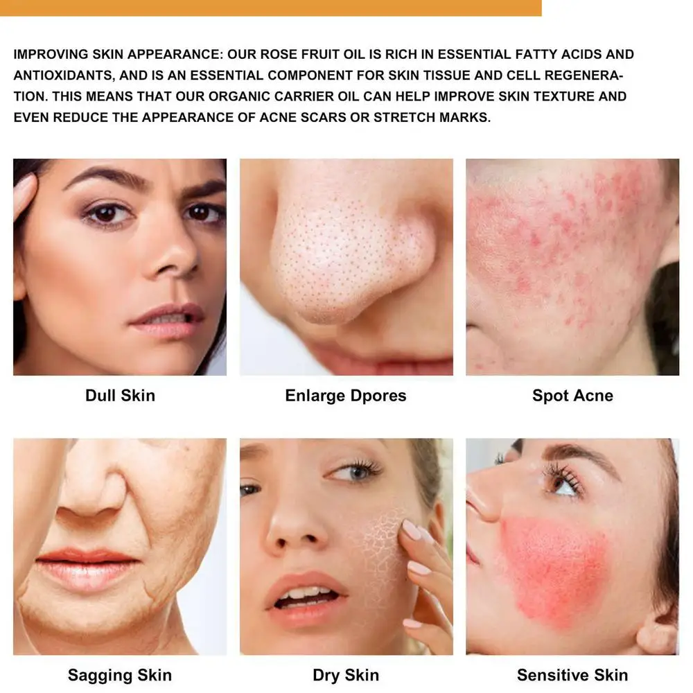 4.Repairing and Enhancing: Enjoy younger and healthier-looking skin that glows with radiance with the nourishing and repairing benefits of rosehip oil. This oil effectively eliminates fine lines and sagging, leaving your skin revitalized and enhanced with consistent use.